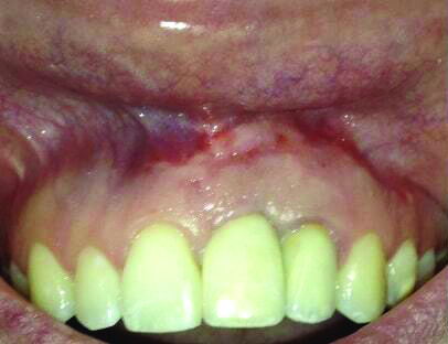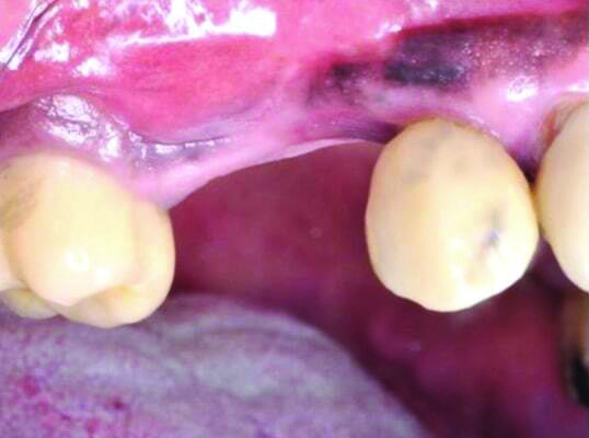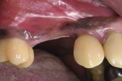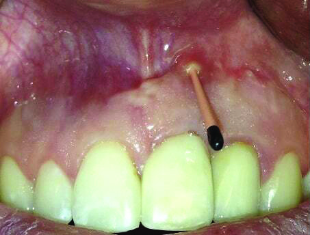 Patient 1: A 30-year-old female patient with an unremarkable medical history presented with implant No. 9 exhibiting retrograde peri-implantitis. Tooth No. 9 had been replaced with the implant 8 years prior because of a history of trauma and failed root canal treatment. The implant exhibited a periapical radiolucency with the sinus tract tracing to the apex of implant No. 9 (Figure 1 and Figure 2). The patient had a high smile line with longer clinical crowns at Nos. 9 and 10 compared with Nos. 7 and 8 (Figure 1 and Figure 2).