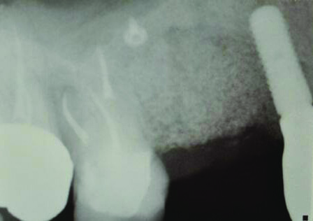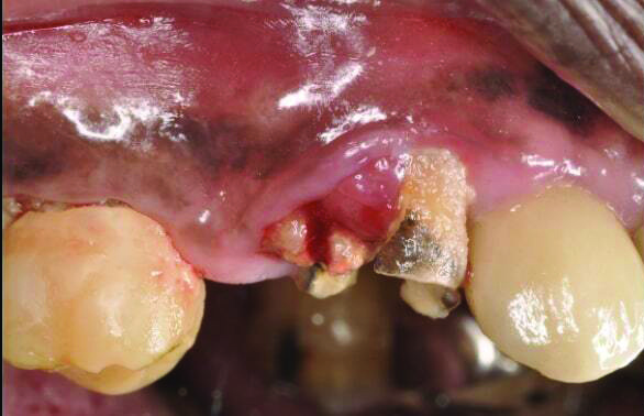 The patient in case 2 received a crestal incision with full-thickness flap elevation, then tooth No. 5 was extracted (Figure 9). Implant debridement followed the same protocol used in case 1. FDBA was mixed with a small amount of doxycycline and placed around the implant (Figure 10). A resorbable collagen membrane (not pictured) was secured with a tack. Primary closure was achieved with expanded polytetrafluoroethylene (ePTFE) sutures (Figure 11). An immediate post-surgical radiograph showed bone fill and the tack (Figure 12).