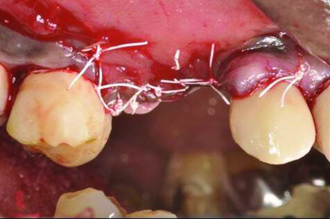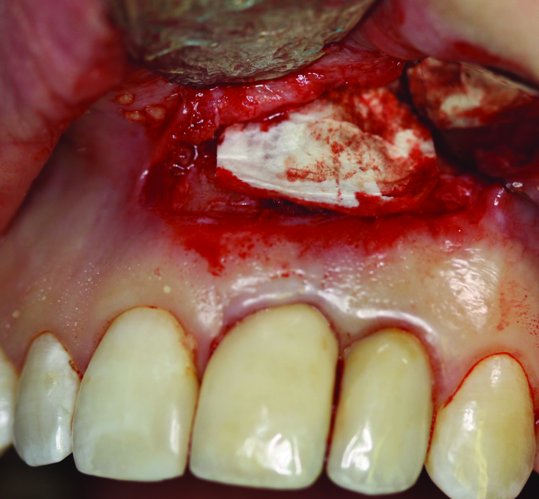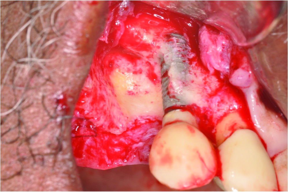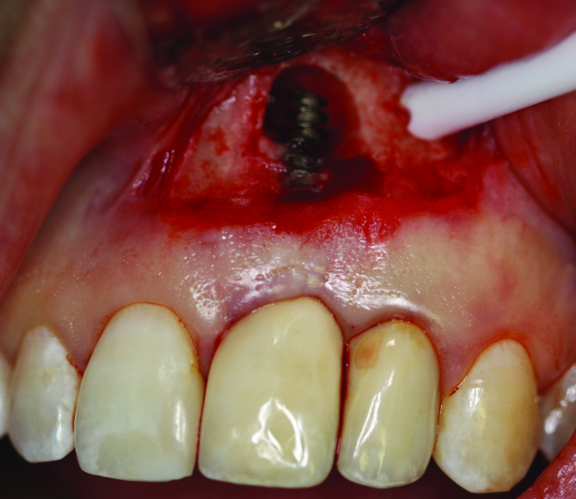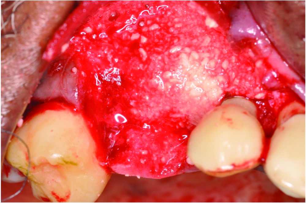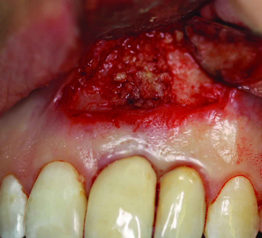 In case 1, due to the high smile line and asymmetrical clinical crown lengths, the patient received a vestibular incision at the mucogingival junction with full-thickness flap elevation to access the implant apex. Implant debridement was performed with titanium curettes and brushes (Figure 5). The implant surface was treated for 2 minutes with a doxycycline–saline slurry. The peri-implant defect was grafted using particulate freeze-dried bone allograft (FDBA) (Figure 6) and covered with a collagen membrane (Figure 7). Primary flap closure was obtained using resorbable sutures (Figure 8).