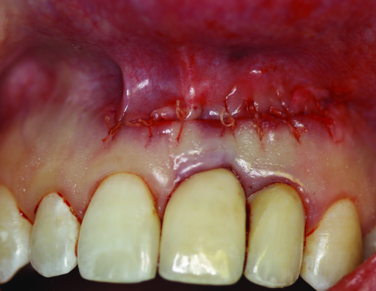 Post-surgically, both patients were prescribed amoxicillin 500 mg and ibuprofen 800 mg three times daily for 7 days along with chlorhexidine. Post-surgical instructions were provided, and the patients were to resume gentle brushing after 4 weeks. They received periodontal maintenance every 3 months and were followed postoperatively for 12 months (case 1) and 1 to 7 years (case 2).