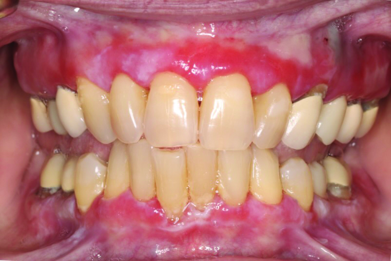 Patients with DG frequently report mucosal sloughing, gingival bleeding, and oral discomfort, especially when consuming acidic or spicy foods and beverages. Topical steroids, with or without initial systemic steroid therapy, are the primary treatment for rapid disease control. A soft plastic stent that covers the gingiva is helpful for holding the steroid under occlusion, although gauze can also be used for this purpose.10 Studies have shown improvement when patients adhere to strict oral hygiene protocols and receive regular professional cleanings, with the best results achieved when combined with topical corticosteroid therapy.10