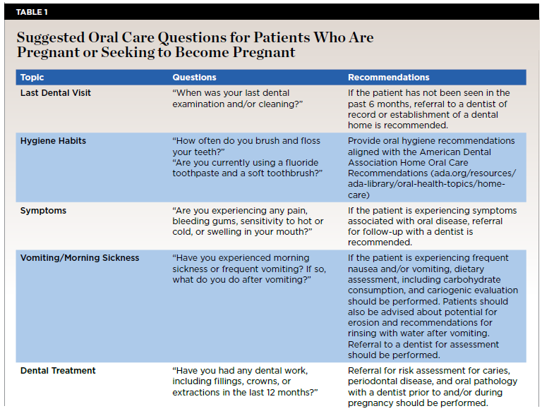 Both medical and dental healthcare providers should emphasize the need for enhanced awareness of the relationship between periodontal disease and overall health. Screening for periodontal disease and periodontal risk factors by medical providers and subsequent referral for comprehensive assessment and treatment of periodontal conditions could provide avenues to enhance dental care delivery for at-risk individuals. Despite recommendations from the American College of Obstetricians and Gynecologists for women who are pregnant or seeking to become pregnant to receive dental examinations and treatment, 56% of women do not receive dental care in the perinatal period and most women (59%) receive no counseling about oral health during pregnancy.5 It is recommended that perinatal healthcare providers include health questionnaire inquiries about oral health and dental history as a part of medical assessments for patients who are pregnant or seeking to become pregnant (Table 1).6 In a complementary fashion, dental healthcare providers should query patients about family planning, family history of infertility, and reproductive health to allow for patient counseling and better interprofessional communication. Moreover, gathering additional medical history information related to reproductive health can inform oral health examinations and risk assessments related to periodontal health.