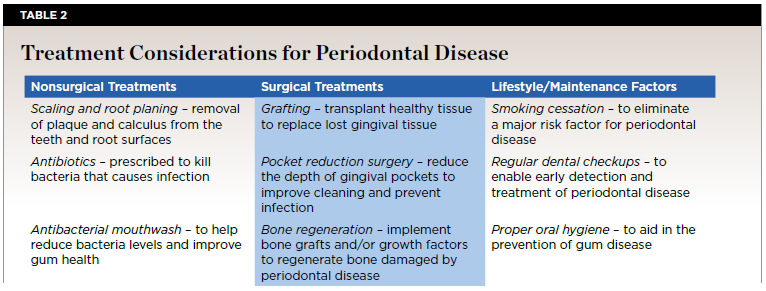 While this biofilm-induced inflammation and tissue destruction occurs locally at the surrounding tissues around teeth, the subsequent inflammatory markers, pathogenic bacteria, and bacterial virulence factors may also enter the systemic circulation and influence overall systemic wellness. A common inflammatory burden from periodontitis and chronic inflammatory diseases may exacerbate both these systemic conditions and periodontal tissue destruction.19 Treatments for periodontal disease involve removal and/or alteration of dysbiotic biofilm, elimination of niches frequently colonized by pathogenic bacteria, and host modulation strategies to alter the immune response to bacteria and virulence factors (Table 2).20 Successful periodontal therapy results in a long-term decrease in pro-inflammatory biomarkers locally and systemically, and this reduced inflammatory burden may ameliorate risks for systemic inflammatory conditions and decrease systemic disease severity and/or progression.21