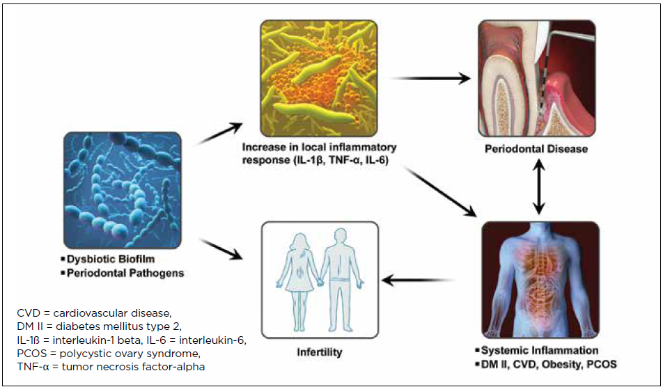 An association has been identified between periodontal disease and infertility, and this link has attributed, in part, with a common inflammatory burden impacting both diseases. While this association does not imply causation, an increased prevalence of primary and secondary infertility was seen in individuals with periodontal disease compared to healthy controls. Further, it is well-established that active periodontitis has been associated with increased systemic inflammatory burden, insulin resistance, dysglycemia, and oxidative stress.27,28
