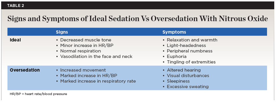 Nitrous oxide oversedation refers to the condition in which a patient is administered an excessive concentration of N2O, leading to extreme sedation or unintended side effects beyond the desired levels of conscious sedation.8 This can occur when N2O is given at concentrations above recommended levels or for longer durations than necessary. Symptoms of oversedation include altered hearing, visual disturbances, sleepiness, sweating, or other signs of discomfort (Table 2). Reducing the N2O levels by 5% has been recommended when any signs of oversedation are noticed.