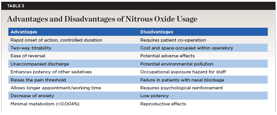 While several adverse effects of nitrous oxide sedation, as described below, are possible, it is important to note that N2O administration under conditions stated in various guidelines is a safe technique. An evaluation of nearly 36,000 cases of 50% N2O sedation revealed only 0.03% serious adverse events, with 0.5% to 1.2% being nausea and vomiting.21 Clinicians should conduct a thorough review of the advantages and disadvantages of nitrous oxide use for each patient before treatment (Table 3).