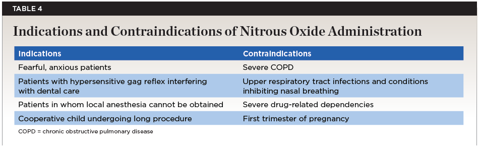 Although nitrous oxide is deemed to be a universally accepted adjunct of treatment, a review of the patient’s medical history is essential when considering whether or not to use it, as mentioned previously (Table 4). Assessment of the patient should include previous allergies to medication, diseases, pregnancy status, and previous hospitalizations.