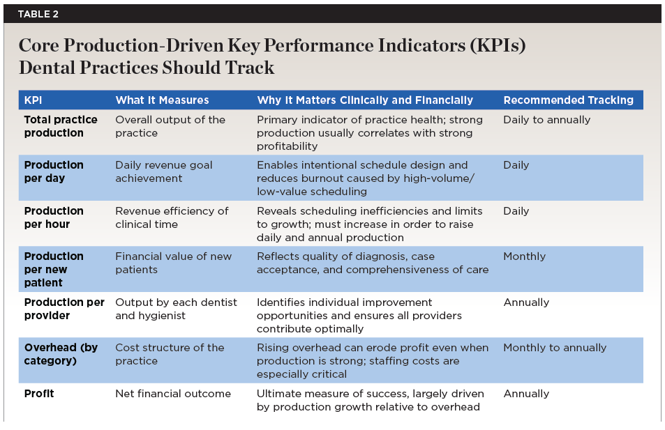 The following seven KPIs are all relative to practice production (Table 2). They can be easily tracked and quickly assessed to be underperforming, on target, or overperforming.