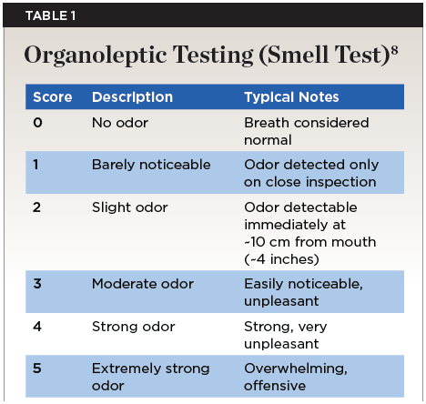 In an organoleptic assessment, a trained clinician smells the patient’s exhaled air and assigns a score based on odor intensity (Table 1)5,24,71 (scale: 0 [no odor] to 5 [severe malodor]).8 This method is simple, inexpensive, and allows for immediate feedback. It is, however, subjective, influenced by clinician sensitivity and patient factors (eg, recent food or drink).