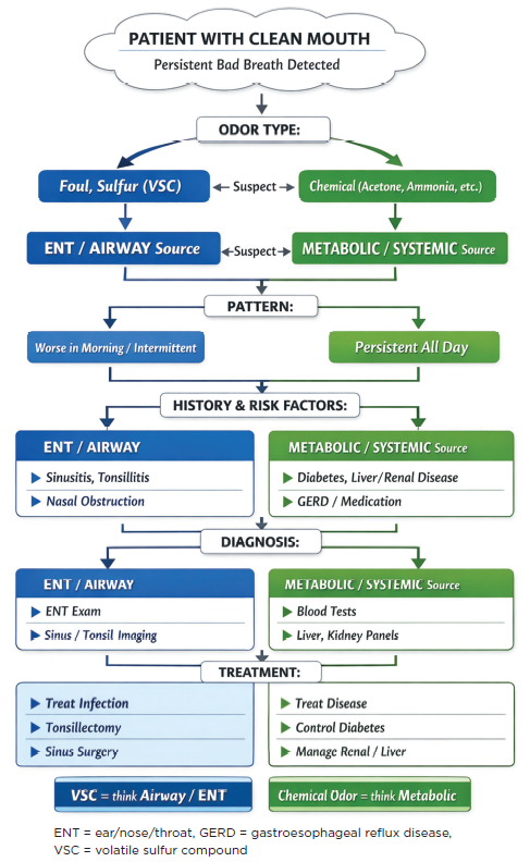 In cases of persistent malodor without an identifiable oral source, further investigation is needed to exclude extraoral or psychogenic causes, with appropriate medical referral when indicated. Figure 1 demonstrates how to differentiate between airway/ENT and metabolic/systemic halitosis.22,33,36,40