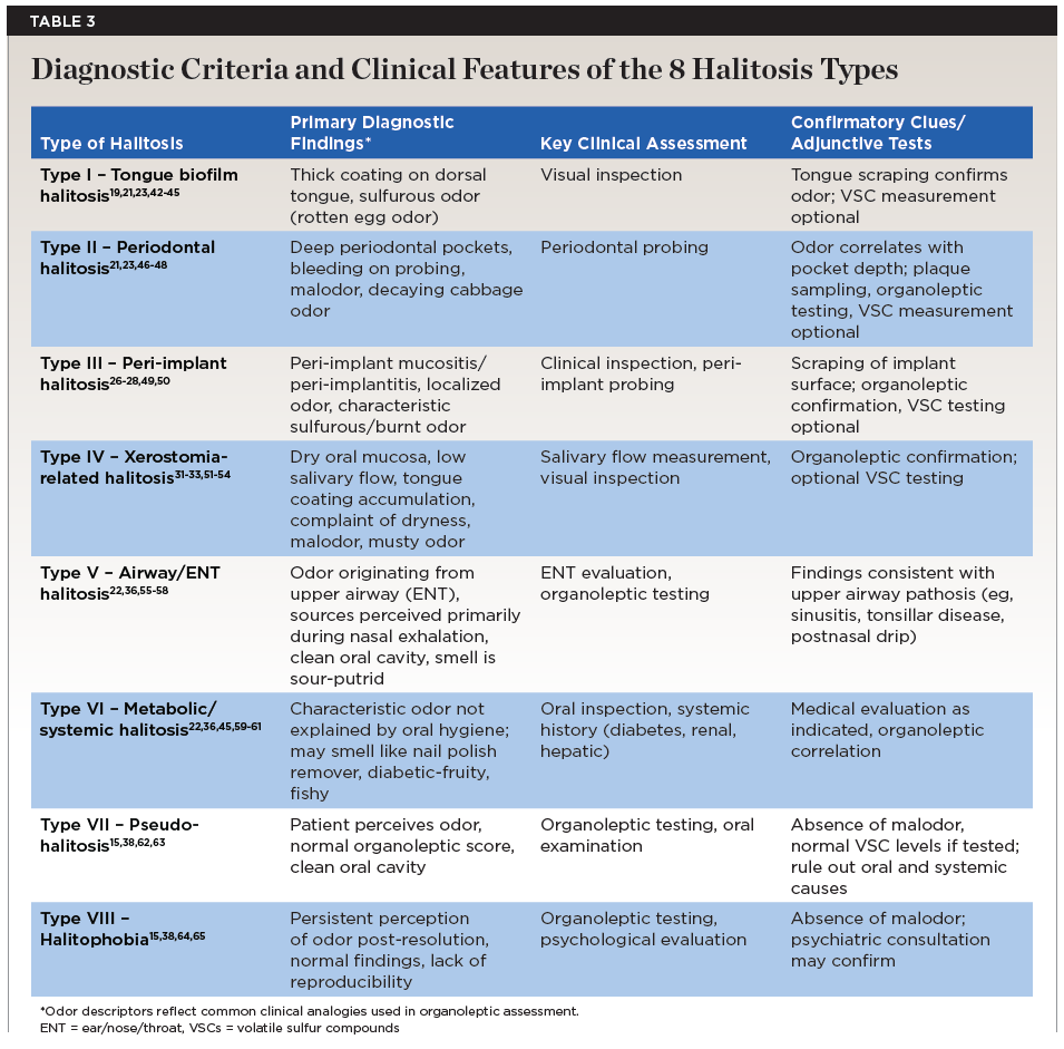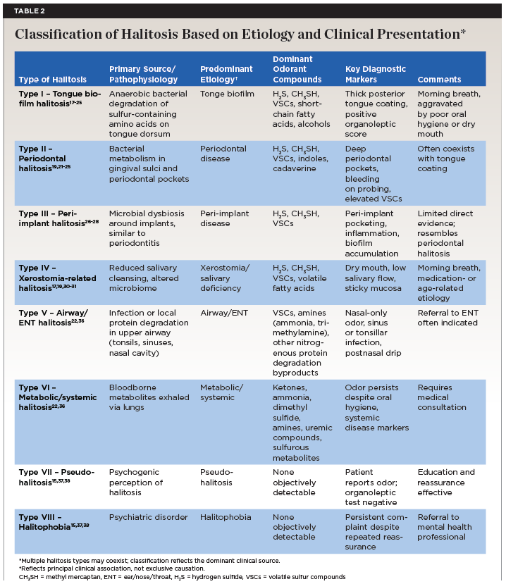 Halitosis should be classified according to underlying pathophysiologic processes that generate malodor rather than by symptom perception alone.39 Table 2 presents a clinical classification system listing eight proposed types of halitosis and their defining features.15,17-28,30,31,36-38 While eight types are listed, only types I through VI represent biologic malodor-generating diseases; types VII and VIII are diagnostic endpoints reflecting psychiatric presentations rather than odor-producing pathosis. In this article, halitosis is classified by its dominant etiology and clinical presentation; however, overlap between categories may occur and clinical judgment remains essential for assigning a reason for malodor.
