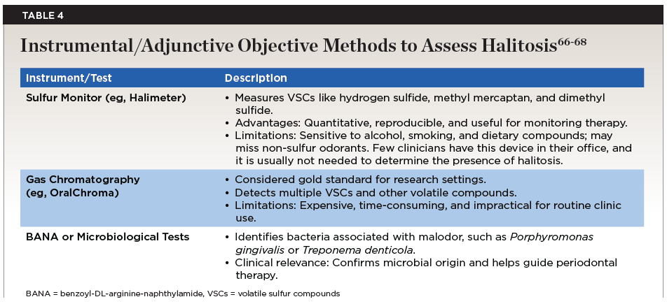 4. Instrumental corroboration—A Halimeter (VSC measurement) or OralChroma (gas chromatography) device, or alternate verifying tests, may be used for odor (Table 4).18,19,66-68 When instrumental analysis is not available, additional biological correlates can be used to support the diagnosis, including visual scoring of tongue coating and assessment of odor from tongue scrapings.69,70 In most private practice settings, these simple adjunctive tests, along with a thorough history and organoleptic assessment, are sufficient in approximately 85% to 90% of cases.69,70