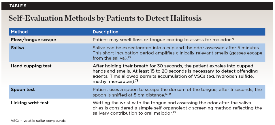 Patient self-evaluation methods for halitosis are listed in Table 5. Note that none of these tests provide an accurate or reproducible appraisal of true halitosis.66,73 However, as part of a follow-up program, patients can use the breath waft test discussed above and have someone assess their daily progress; this can provide some self-assurance that they are odor free.