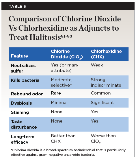 Antimicrobial mouthwashes—Chlorhexidine, cetylpyridinium chloride, or essential oil–based rinses reduce oral bacterial load.80 Other touted products contain chlorine dioxide. Evidence suggests that chlorine dioxide–based rinses function primarily via chemical neutralization rather than masking of odors.81-83 Chlorine dioxide oxidizes hydrogen sulfide, methyl mercaptan, and dimethyl sulfides to odorless sulfates.81-83 Table 6 provides a comparison of benefits regarding chlorine dioxide versus chlorhexidine.81-83