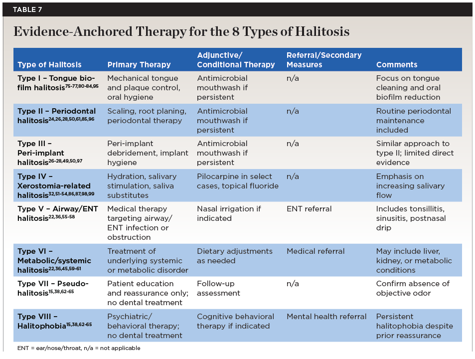 Table 7 summarizes usual therapy for the eight halitosis types described in Table 1 and Table 2.15,22,24,26-28,32,36,38,49-65,75-77,80-87,95-99 Because these groupings reflect fundamentally different sources of malodor, effective management depends on aligning treatment with the origin of odor production, the likelihood of extraoral involvement, and the risk of unnecessary treatment.