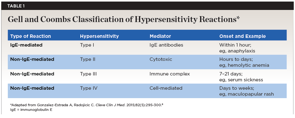 Gell and Coombs classified hypersensitivity into four main types: I, II, III, and IV (Table 1). The prevalence of life-threatening anaphylactic reactions to penicillin ranges between 0.02% and 0.04%.6 Clinical manifestations of penicillin allergies can be immediate (IgE-mediated via Type I hypersensitivity reaction) or delayed (non-IgE mediated via complement system) based on the timing and type of immune response (Table 2). Most delayed reactions are via Type IV hypersensitivity reaction, but Types II and III can also play a role.1 Such delayed reactions can range from mild to severe and manifest across various organ systems. The most common clinical manifestation, however, is cutaneous.6,7