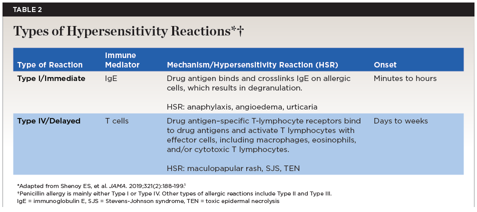Risk stratification based on allergy history is reported to reduce treatment failure and increase clinical outcomes in patients that had methicillin-sensitive bacteremia and reported penicillin allergy when compared to administering alternative antibiotics.1 Stratification involves detailed patient history and categorizing reactions into immediate (IgE-mediated) and non-immediate (T-cell mediated) hypersensitivities. Immediate reactions occur within 1 hour of exposure and include symptoms such as urticaria, angioedema, and anaphylaxis. Non-immediate reactions manifest hours to days later and include morbilliform rashes and SJS.6