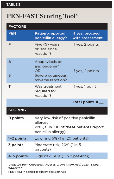 The penicillin allergy decision rule (PEN-FAST) provides a clinical decision-making framework based on factors like the nature of the allergic reaction, time elapsed since the reaction, and whether treatment was required during the initial reaction.20 PEN-FAST aids clinicians in identifying low-risk patients and stratifying patients to determine their risk of true penicillin allergy and guide further testing and treatment decisions.20,21 The degree of penicillin allergy risk is ascertained using a point-scoring system with values ranging from 0 to 5 based on the total number of points (Table 3).4 A total score of 0 indicates very low risk of positive penicillin allergy, a total score of 1–2 signifies low risk, a total score of 3 denotes moderate risk, and a total score of 4–5 indicates high risk for positive penicillin allergy. It should be noted that screening patients who have not reported a previous allergic reaction is not recommended.2,12