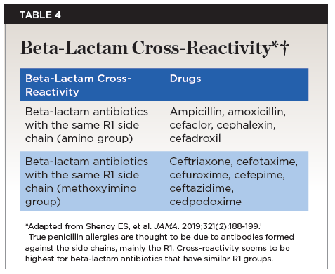 Selecting alternative antibiotic drugs for patients who report penicillin allergy is a major consideration for clinicians. Cephalosporins seem to be generally avoided, as cross-reactivity with penicillin allergy has been reported, although this concern appears to be lessening as data increasingly shows a lower risk of cross-reactivity, from previously reported 8% to 2%.1,2 Cross-reactivity is reported mainly with amino cephalosporins (Table 4). Cefazolin has a different side chain and is less likely to have a cross-reactivity.1 Cross-reactivity between penicillin and other medications like carbapenems has been reported to be 1%, and no known cross-reactivity has been reported with monobactams.1