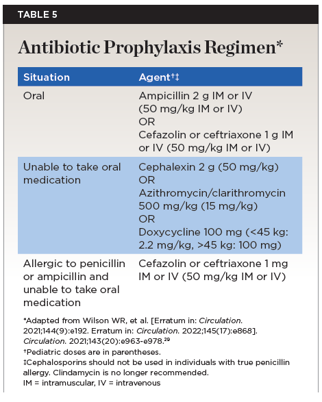 For antibiotic prophylaxis, the American Heart Association’s updated guideline is recommended (Table 5),29 along with American Dental Association guidelines.