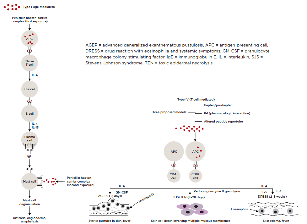 The mechanism of action of Types I and IV hypersensitivity reactions in penicillin allergy is depicted in Figure 1.