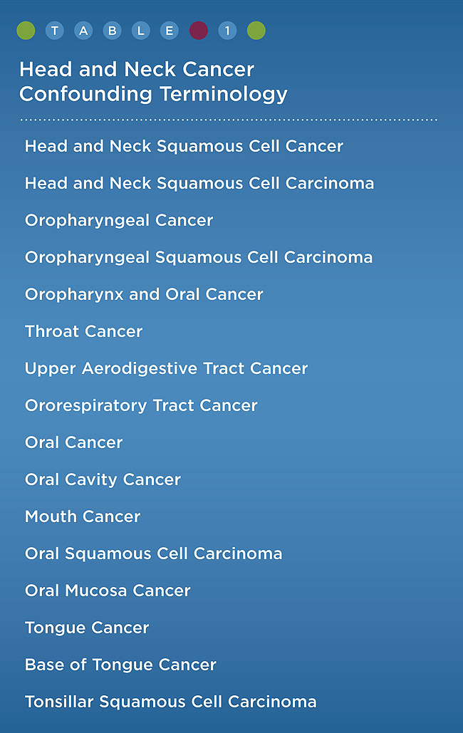 Unfortunately and confusingly, in both peer-reviewed and non-peer-reviewed medical and dental journals in the English language, there are numerous published articles and advertisements that interchangeably use a variety of head and neck cancer terms to cite statistics, facts, and current research findings about "oral cancer" (Table 1). Closer scrutiny reveals that the authors are often reporting not only "oral cavity proper" carcinoma facts and statistics but often also those of oropharyngeal carcinoma, and, less often, hypopharyngeal (eg, laryngeal carcinoma), nasopharyngeal (eg, nasopharyngeal carcinoma), as well as non-epithelial malignancies (ie, sarcomas). Additionally, some reports include morbidity and mortality data from the nasal passages, paranasal sinuses, major salivary glands, and thyroid gland.