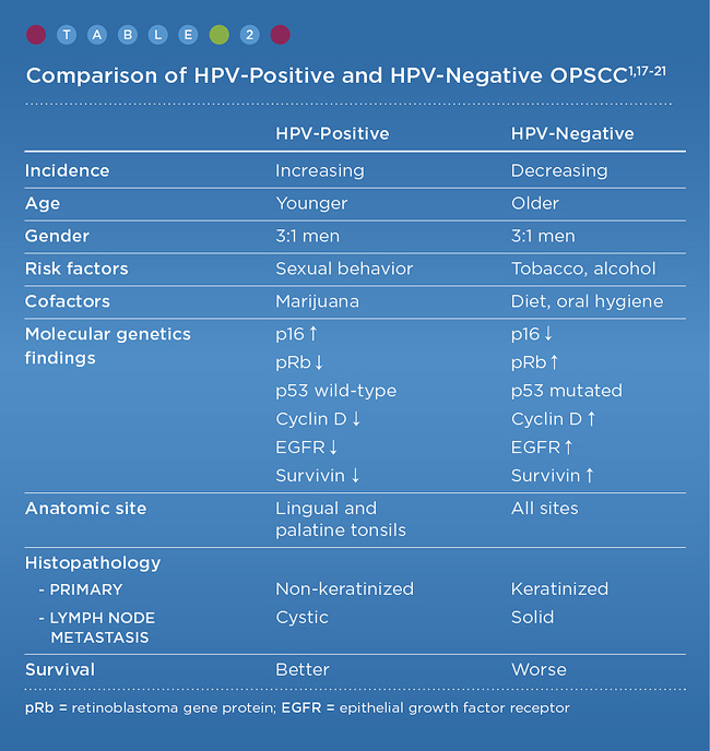Within the past decade, epidemiological and molecular studies have revealed that, in fact, these two sites of squamous cell carcinoma are heterogeneous.11-15 To date, the most important revelation is that a unique subset of oropharyngeal carcinoma exists, caused by sexual transmission of certain types of HPV, especially type 16.16 The molecular evidence for HPV-16 infection in OPSCC is as strong as for cervical carcinoma with respect to high-risk DNA present, tumor specificity, E6/E7 expression, clonality-copy number, clonality-integration, and, to a lesser degree, clonality-variant analysis and malignant phenotype. HPV-associated OPSCC has also been shown to be a distinct molecular-genetic entity with respect to amount of wild versus mutant p53 and prRb, p16, cyclin D, epithelial growth factor receptor (EGFR), and survivin17-21 (Table 2). Furthermore, the gene expression profile for HPV-positive OPSCC has 89 genes with higher expression and two genes with lower expression.22 The HPV type distribution in HPV-positive OPSCC is 92% for type 16 with types 18, 33, 35, 45, and 59 each contributing a minor amount.23 HPV-16 seropositive individuals are at a distinct increased risk for oropharyngeal carcinoma compared to the oral cavity and other sites such as the larynx, nasal cavity, paranasal sinuses, and lips.24