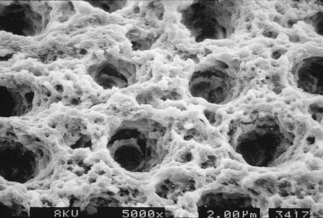 The acids and/or acidic primers and conditioners used with either total- or self-etching bonding systems do not just remove and/or disrupt the smear layer, but create a thin zone of demineralization that is either subsequently (total-etch) or concurrently (self-etch) infiltrated with various bifunctional primers and resins (Figure 4). In the case of dentin, acid exposure removes or modifies the smear layer, raises surface energy, opens and exposes dentin tubules to varying degrees, and results in dissolution of the inorganic hydroxyapatite matrix. As the matrix dissolves, the collagen fibrils, which are inherent in dentin, become exposed as they are no longer supported and surrounded by their inorganic scaffolding (Figure 5). It is this friable “collagen network” that must be infiltrated by subsequently placed primers and resins to ensure good bonding.6 The degree and depth of demineralization, as well as the degree of tubule exposure and opening, is contingent on the type of acid used, its concentration, and the application time. It is this demineralized zone that must be infiltrated as completely and thoroughly as possible to ensure predictable bonding.