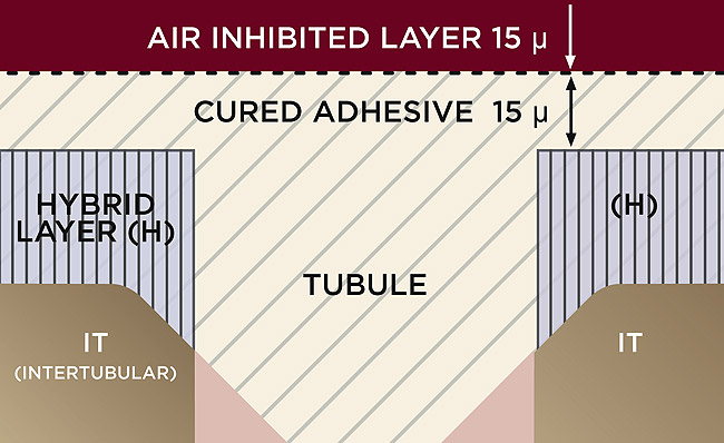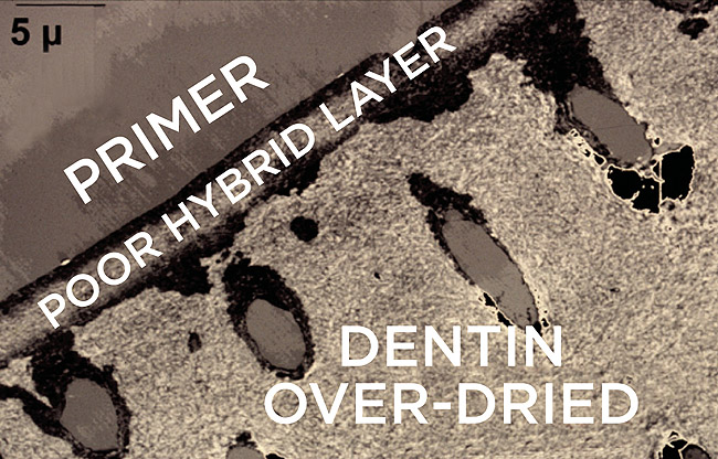 It is often erroneously assumed that the thicker the hybrid layer, the better. In fact, the hybrid layer, which in the case of total-etch is largely resin-encapsulated collagen, is of little quantitative benefit in terms of bond strength regardless of thickness.8,9 Good hybrid layer formation is simply indicative of thorough resin infiltration through the demineralized zone and engagement of basically intact dentin that has not (or has minimally) been affected by acidic pretreatment and is still mineralized to some degree. In this sense, the goal of effective hybridization is complete and thorough penetration through the demineralized zone, whatever its thickness, and engagement of the underlying and still mineralized dentin (Figure 6).