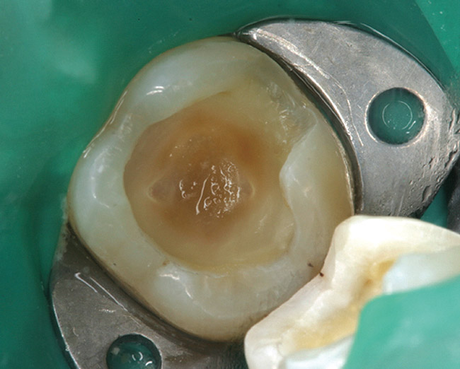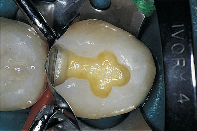 One way to eliminate the ambiguity some practitioners have with the wet-bonding protocol when employing a total-etch system is to use a technique that eliminates or minimizes the significance of wet-bonding. This can be accomplished by using a resin-modified glass-ionomer (RMGI) liner that covers exposed dentin. Basically, the RMGI liner is placed on as much of the exposed dentin as possible in a thin layer before the etching step (Figure 13, Figure 14, Figure 15 and Figure 16). If most or all of the dentin is covered by the RMGI liner before etching, wet-bonding becomes a non-issue. This is because no demineralization of the dentin will have taken place and, hence, there is no exposed collagen to collapse on air-drying.