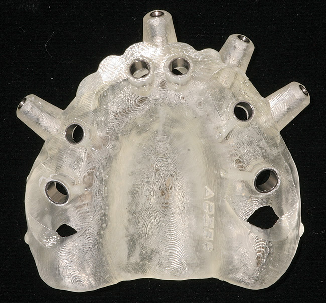 The manufacture of a SLA guide or model involves reproducing the object’s digitally planned dimensions by using a laser beam to selectively solidify an ultraviolet-sensitive liquid resin. Inherent potential problems can lead to light sensitivity and expansion and/or contraction of SLA materials, which distort when exposed to light for extended periods of time and when sterilized in high-temperature autoclaves. Regardless of the irrigation system used, implant site preparation using surgical drill guides generates more heat than conventional implant site preparation.24