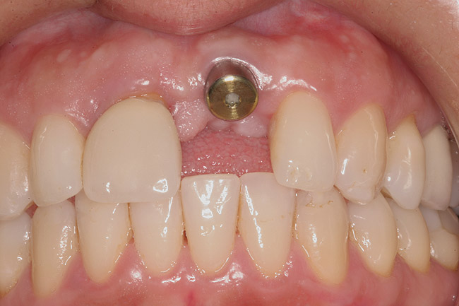 Although technologies are available to place immediate definitive restorations, most clinicians are placing provisional restorations, for many reasons. Whether performed flaplessly or not, after surgery the final gingival contours and anatomy cannot be predicted. The clinician and dental technician can gain invaluable information as to the gingival contours and esthetics by observing tissue responses from the provisional restoration. Whether implant placement is guided or nonguided, a small number of implant failures occur. Most surgery-related failures take place within the first 3 to 4 months after implant placement. Surgical and restorative implant failure management is best accomplished prior to insertion of the definitive restoration. According to Abrahamsson et al, changing from a healing abutment to a permanent abutment did not result in a change in the dimension and quality of the transmucosal attachment that developed. It did not differ from the mucosal barrier that formed on a permanent abutment placed after surgery.31 An acrylic resin occlusal surface or a composite restoration reduces the forces of impact and has a better shock-absorbing behaviour compared to ceramic materials32; this is an additional reason for placing immediate acrylic resin provisional restorations, rather than immediate definitive porcelain restorations.