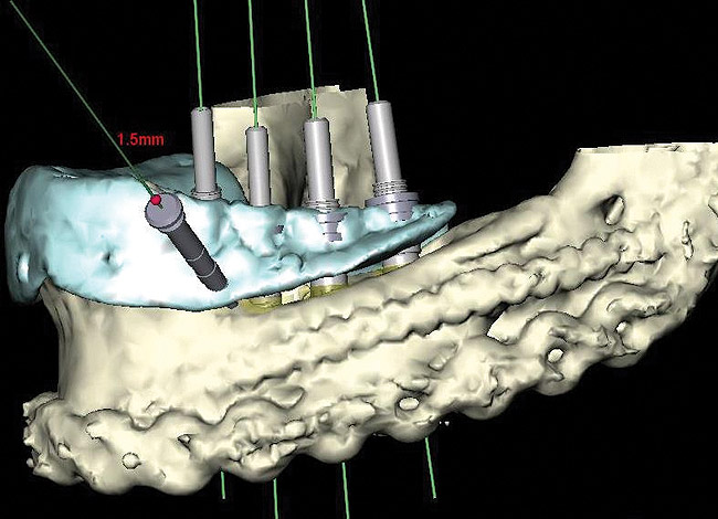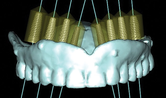 When three or more implants in a row are planned, concepts of spacing and angulations, parallelism in all dimensions, proximity to anatomic structures, and relationships between implant positions and planned restorations are all significant considerations. CT/CBCT-guided surgery allows for the ideal placement of multiple dental implants according to the planned restoration while taking these issues into consideration (Figure 2 and Figure 3). Implants can be placed flaplessly and immediately loaded.6-8,11-14,25-29