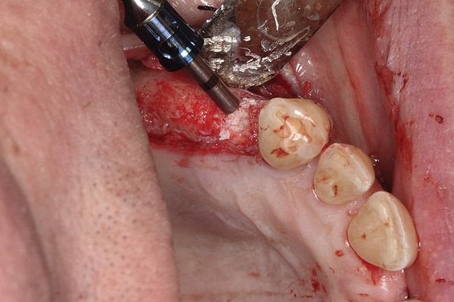 Other possible complications associated with maxillary sinus augmentation may include infra-orbital nerve injury, bruising, and soft-tissue dehiscence. The risk for post-operative infections, which occur in up to 10% of sinus floor augmentation procedures, may be reduced by the use of preoperative antibiotics.10,11 Occasionally, complications such as excessive bleeding from major blood vessels near the bone of the lateral wall or the sinus membrane (Figure 6), hematomas, wound dehiscence, and implant migration into the sinus cavity are also reported to occur.12