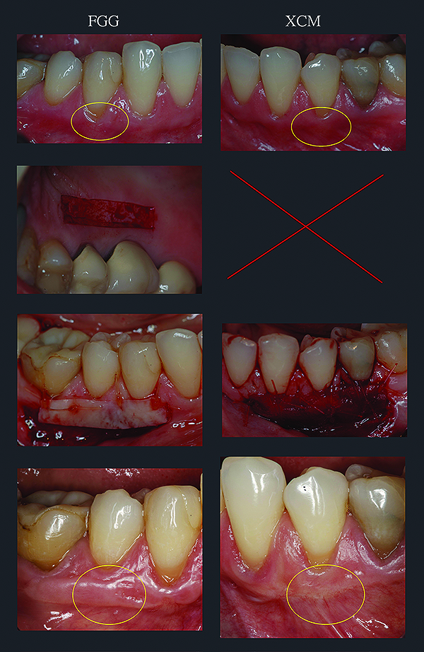 In the author’s study of XCM+CAF for root coverage,24 the team followed 25 patients for 12 months, again using contralateral, within-subject, matched defects to compare the test therapy against the gold standard CTG+CAF (Figure 8). While recession depth (and hence, root coverage) was the primary efficacy endpoint, the author and his coinvestigator also followed traditional clinical parameters such as KT width, along with PROs such as color/texture esthetics, satisfaction, and pain/discomfort.