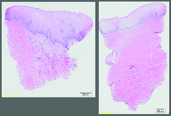 In both the XCM+APF and LCC studies, the harvest graft alternatives generated suitable KT attachment and biopsies showed normal mucoperiosteum with keratinized epithelium (Figure 6).
