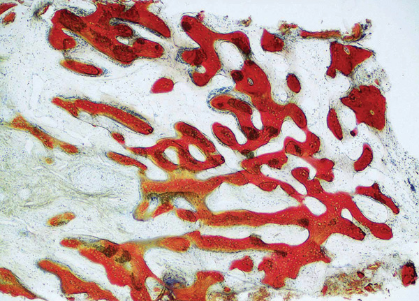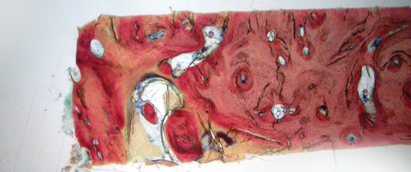 There are concerns that graft materials that fully resorb in a short timeframe may contribute to site collapse. Pure-phase beta-tricalcium phosphate (ß-TCP) (Figure 4) was one of the materials developed to address this concern. In a clinical and histologic study, extraction sockets were shown to have 91% of ridge width preserved when grafted with ß-TCP (Cerasorb®, Curasan, Inc., www.curasaninc.com) and covered with either a collagen or dense PTFE barrier.7 Dental implants were placed in these patients at 4 to 6 months postoperatively, a later time period than in the calcium sulfate studies. The patient shown in Figure 4 had only three maxillary teeth remaining, supporting an ill-fitting removable prosthesis. Due to the significant occlusal forces that were to be demanded on this single-tooth, implant-supported restoration, it was deemed advantageous to maximize the amount of vital bone in the recipient site. The area was left to heal for 7 months before flap exposure (Figure 5), implant placement in an ideal location, and graft analysis in the largest part of the defect. Analysis of the retrieved specimen showed 85% vital bone in the apical 90% of the core and a thin layer of nonresorbed ß-TCP at the crestal portion (Figure 6).