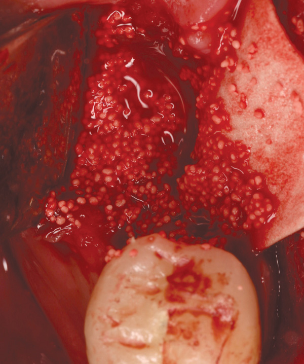 A new form of tricalcium phosphate has been developed for ease of use in a syringe system, which sets the material in the grafted site. The system is made up of one syringe containing 99% ß-TCP granules coated with poly(lactide-co-glycolide) (PLGA). This is mixed with an ampule containing BioLinker® (N-methyl-2-pyrrolidone and water) (GUIDOR® easy-graft®, Sunstar, www.GUIDOR.com) (Figure 7). A study demonstrated the biocompatibility and resorption of this material in extraction sockets.8 With its ability to resorb slowly and fully and to maintain its shape during healing, GUIDOR easy-graft is potentially an ideal bone replacement graft for defects of varying sizes, either with or without a barrier.