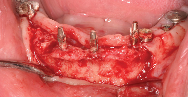 The patient shown in Figure 12 presented with an alveolar ridge in the anterior mandible that was 1 mm wide starting 2 mm below the alveolar crest. The allograft putty was hydrated in sterile saline, covered with calcium sulfate (3D Bond™, Augma Biomaterials, www.augmabio.com) and an Ossix® Plus (Datum Dental Ltd, www.ossixdental.com) barrier, and primary closure was obtained. Narrow-diameter implants (ANEW®, Dentatus, www.dentatus.com) were used to assist in retention of a fixed transitional prosthesis. Four months later, dental implants were inserted, then restored another 4 months later. The clinical result is shown in Figure 13, which provides a 3-year post-loading view of the anterior mandible demonstrating the thickness and health of both the alveolar ridge and keratinized tissue.