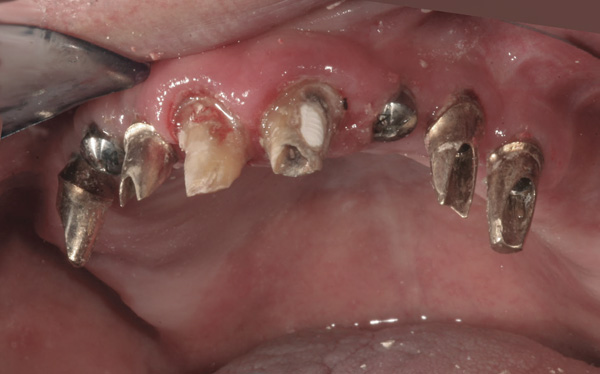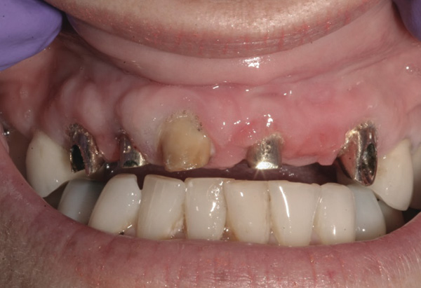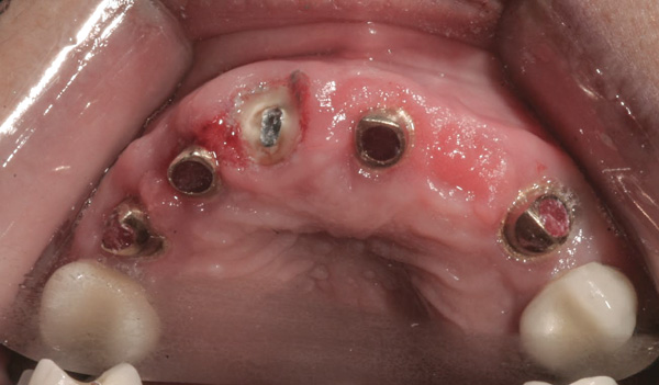 Background: This patient had a failing maxillary dentition and refused to wear a removable prosthesis. A staged approach was employed to retain some of his natural tooth abutments, and recession was noticed at the time of the impression for the second group of implants. Figure 1 shows the patient following insertion of the first set of implant custom abutments; the adjacent natural teeth are still present to support the provisional bridge. Seven months later, as shown in Figure 2, those first-stage custom abutments exhibited evidence of 1 mm to 3 mm of recession.
