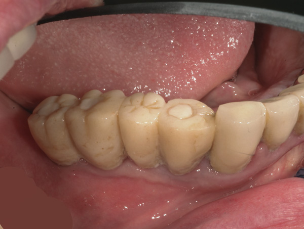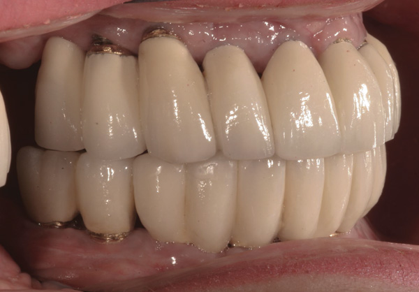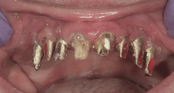 Results: A decision was made to re-prepare all of the abutments intraorally (Figure 3) so that all abutment margins would be at or below the gingival margin. (Of note, teeth Nos. 8 and 9, also shown in Figure 3, were later submerged for the case to be fully implant-supported.) While re-preparation greatly improved the esthetics of the final result, it required retraction cord placement, new impressions, and new castings.