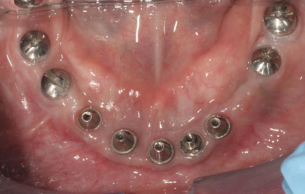 Results: The decision was made to remove these abutments and make a fixture-level impression of all the implants so that both new and first-stage abutments could be milled together for parallelism and proper gingival margin location. Because this requires the removal of the first-stage abutments that were retaining the provisional prosthesis, temporary abutments were placed prior to removal of all custom abutments in order to assure proper seating and vertical dimension of the provisional. These temporary abutments then retained the provisional while all custom abutments were fabricated and/or milled in the laboratory. Figure 12 shows the placement of the remilled (first-stage implants) and new (second-stage implants) custom abutments.