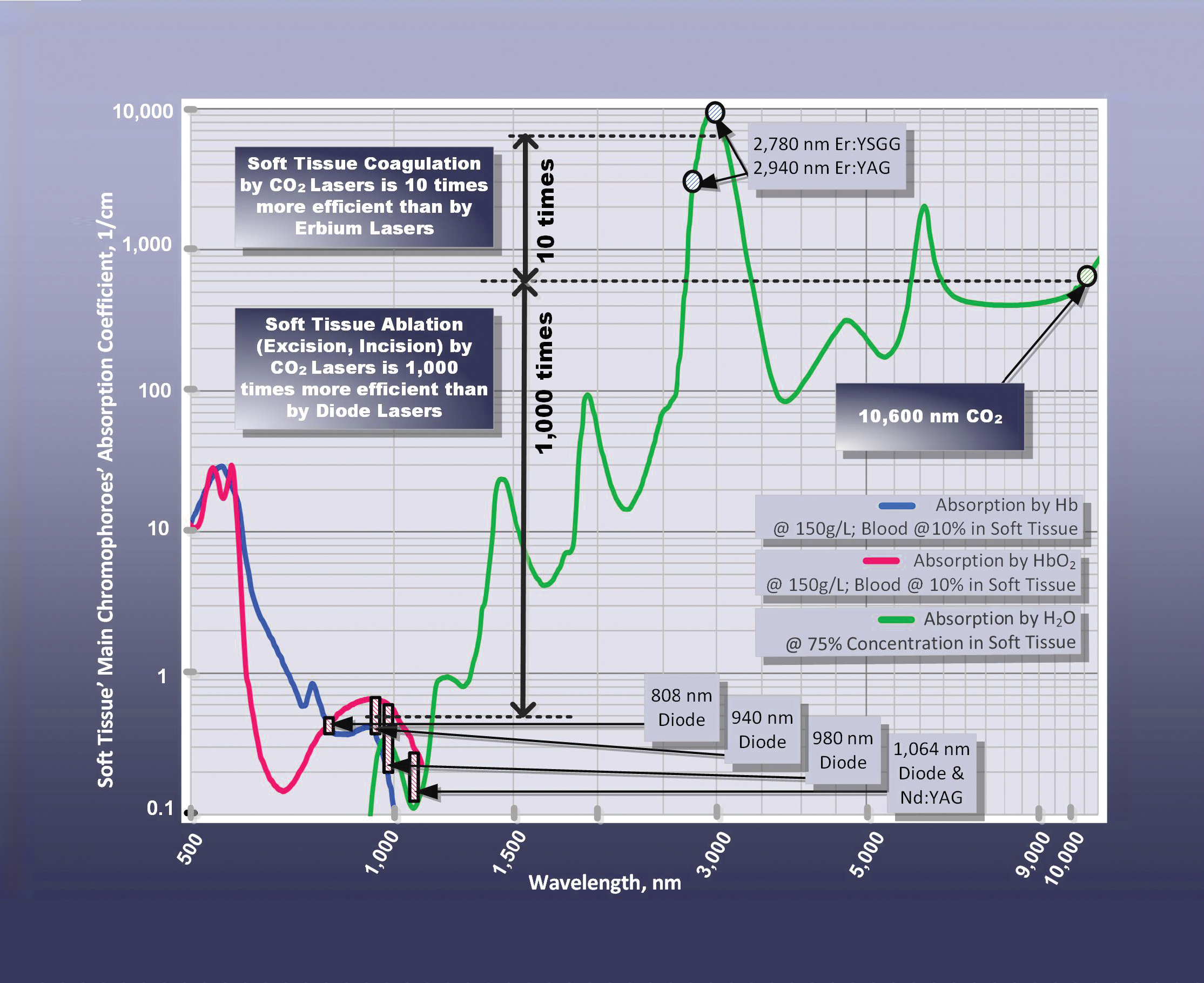 Wavelengths circa 10,000 nm are >1,000 times superior to wavelengths circa 1,000 nm for soft-tissue ablation, and >10 times superior to wavelengths circa 3,000 nm for soft-tissue coagulation and hemostasis. The wavelengths circa 10,000 nm (eg, the CO2 laser) deliver both soft-tissue ablation and simultaneous coagulation, which is unobtainable with either diodes (circa 1,000 nm) or Erbium (circa 3,000 nm) wavelengths.