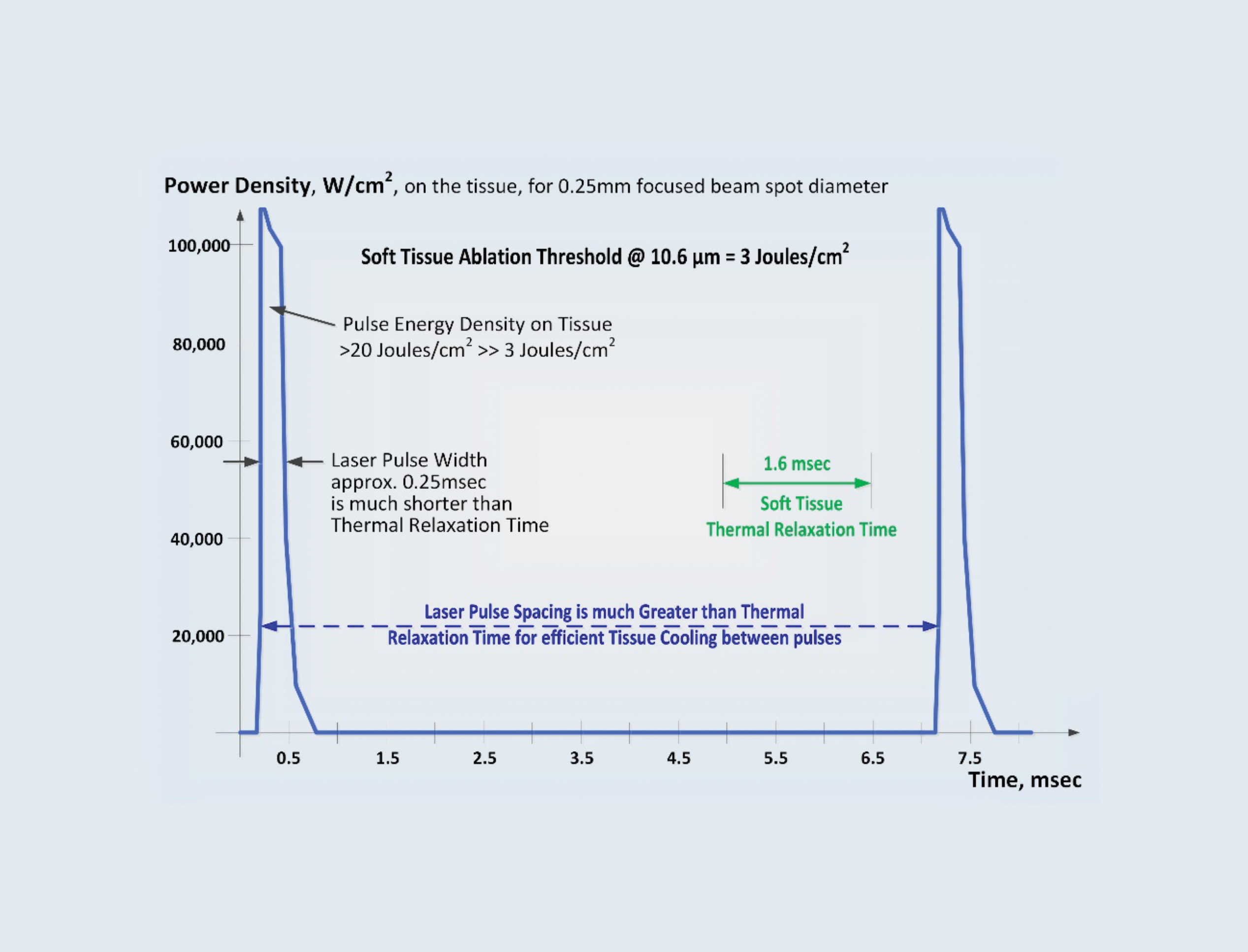 An important parameter to consider when performing a CO2 laser surgery is laser power density. An analogy can be drawn here: regardless of how sharp the blade is, there will be no interaction between the blade and the tissue unless mechanical pressure is applied to the blade, forcing it through the tissue. For the CO2 laser, the power density of the focused laser beam is equivalent to the mechanical pressure that is applied to a cold steel blade—the greater the laser power density, the greater the rate of soft-tissue removal.