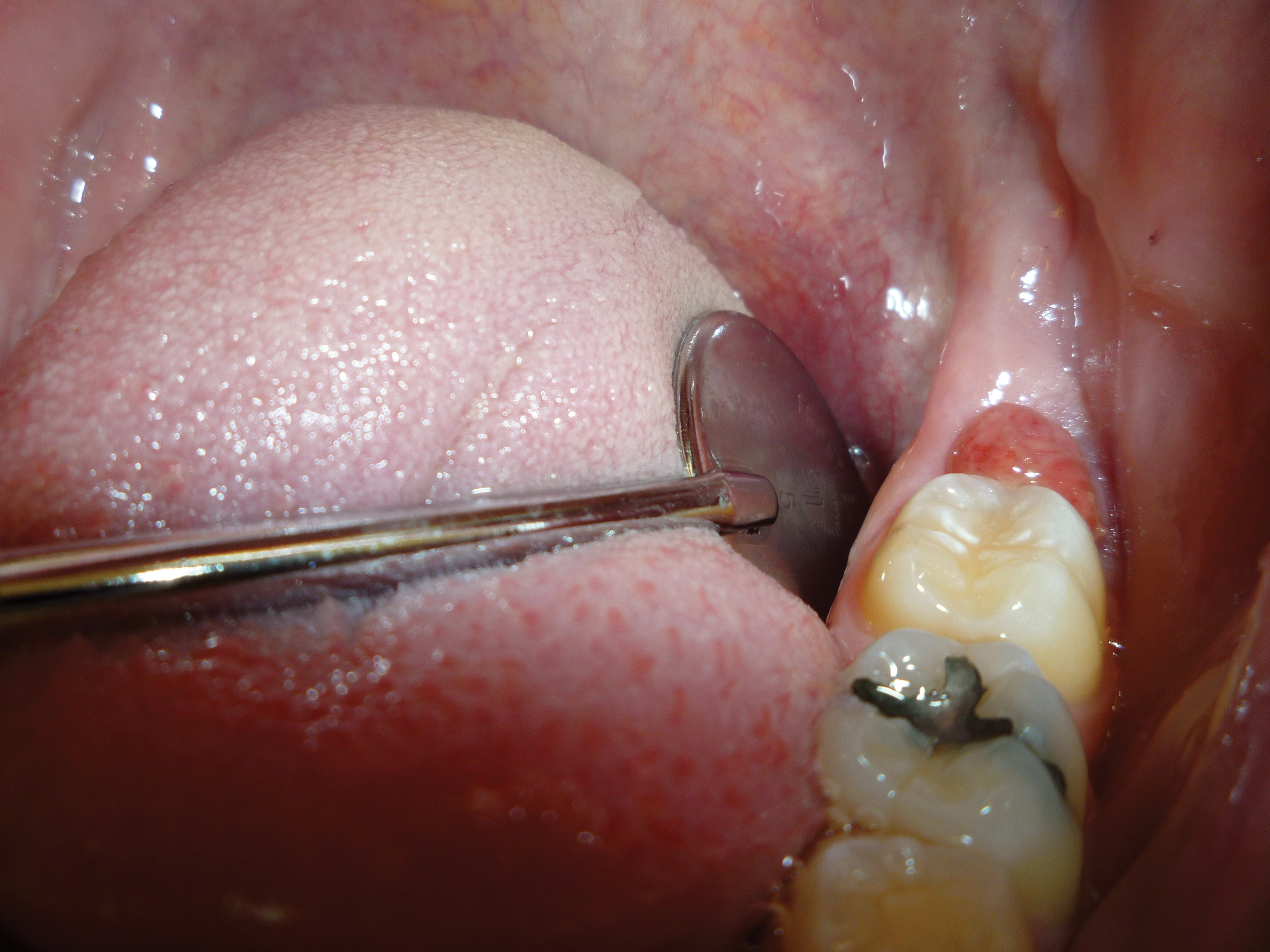 An operculum is a flap of gingival tissue typically distal to a molar that remains as a sequela of the eruption.1 In some cases, an operculum can lead either to pain caused by the occlusion of the opposing maxillary molar (in this instance, the pericoronal gingiva becomes inflamed and often ulcerated because of trauma) or by local inflammation/infection because of food debris and plaque accumulation between the tooth surface and the gingival flap.1 The inflammation in the soft tissues surrounding the crown of the partially erupted tooth is called pericoronitis.2,3 It typically occurs in teeth that erupt very slowly or become impacted. When the follicle of the tooth communicates with the oral cavity, bacterial penetration into the follicular space instigates the infection.2 It is generally agreed that this process is potentiated by food debris trapped in proximity to the operculum and occlusal trauma of the pericoronal tissues by the opposing tooth.2,4 Pericoronitis may be acute or chronic. Acute pericoronitis is characterized by severe radiating pain, localized swelling of the pericoronal tissues, purulence or drainage (hence an unpleasant taste), trismus, regional lymphadenopathy, painful swallowing, pyrexia, and sometimes spreading of the infection to adjacent tissue spaces.2-4 The chronic form may be characterized by dull pain or discomfort, often accompanied by bad taste, lasting a couple of days with remission lasting several weeks or months.2,4 Stress, pregnancy, and/or fatigue are often associated with an increased occurrence of pericoronitis. Diagnosis is done on the basis of the symptoms and clinical presentation.