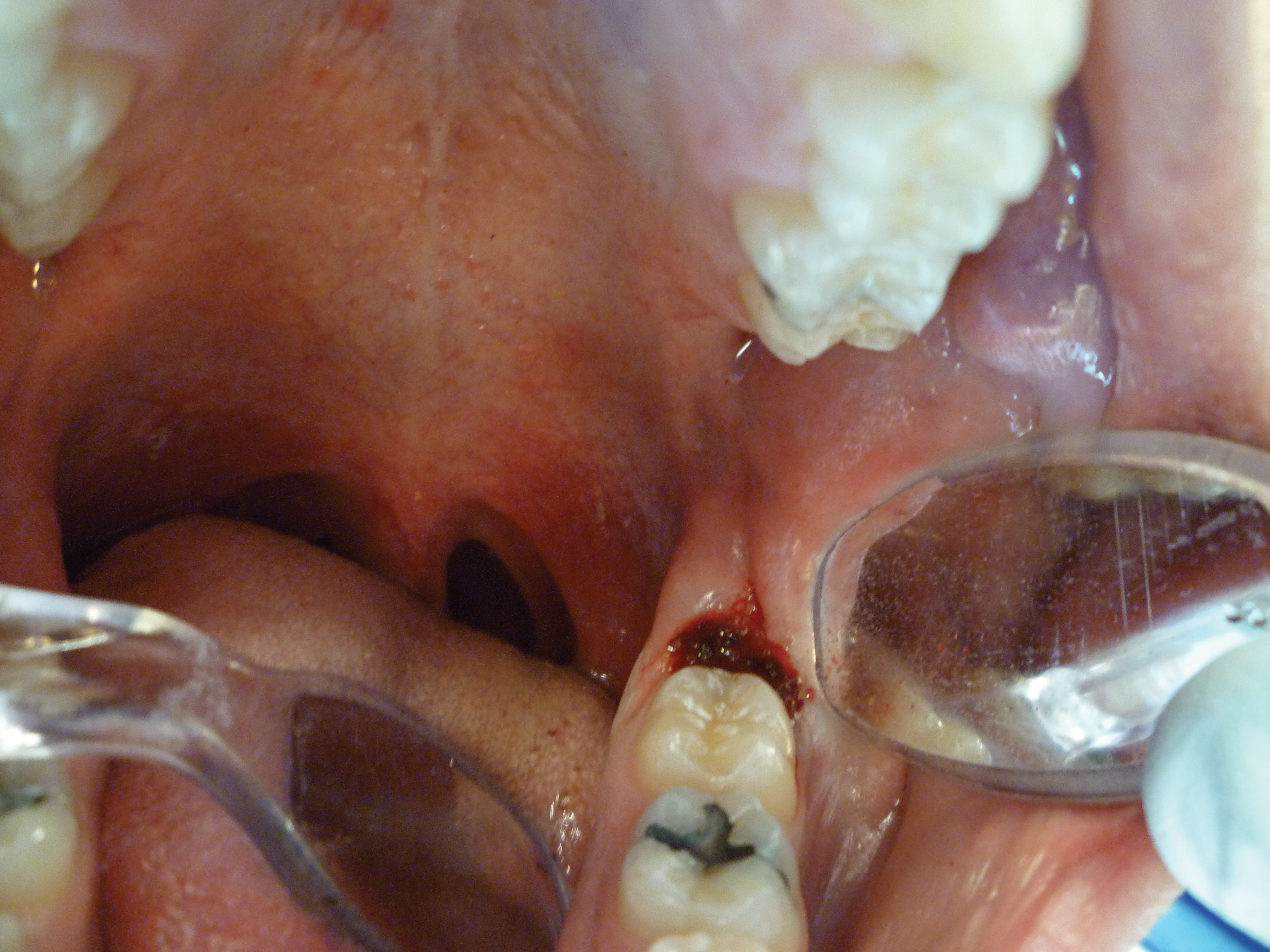 The patient was dismissed with instructions to do warm salt water rinses and mild stimulation of the site with a rubber tip twice a day; he was also instructed to apply topical antibiotic and vitamin E gel twice daily directly to the area. The patient was advised to avoid spicy, acidic, or harsh foods or caustic mouthrinses. Although the patient was prescribed Vicodin 7.5, he did not need pain medications and was happy with the result. He reported to be completely pain-free in 24 hours.