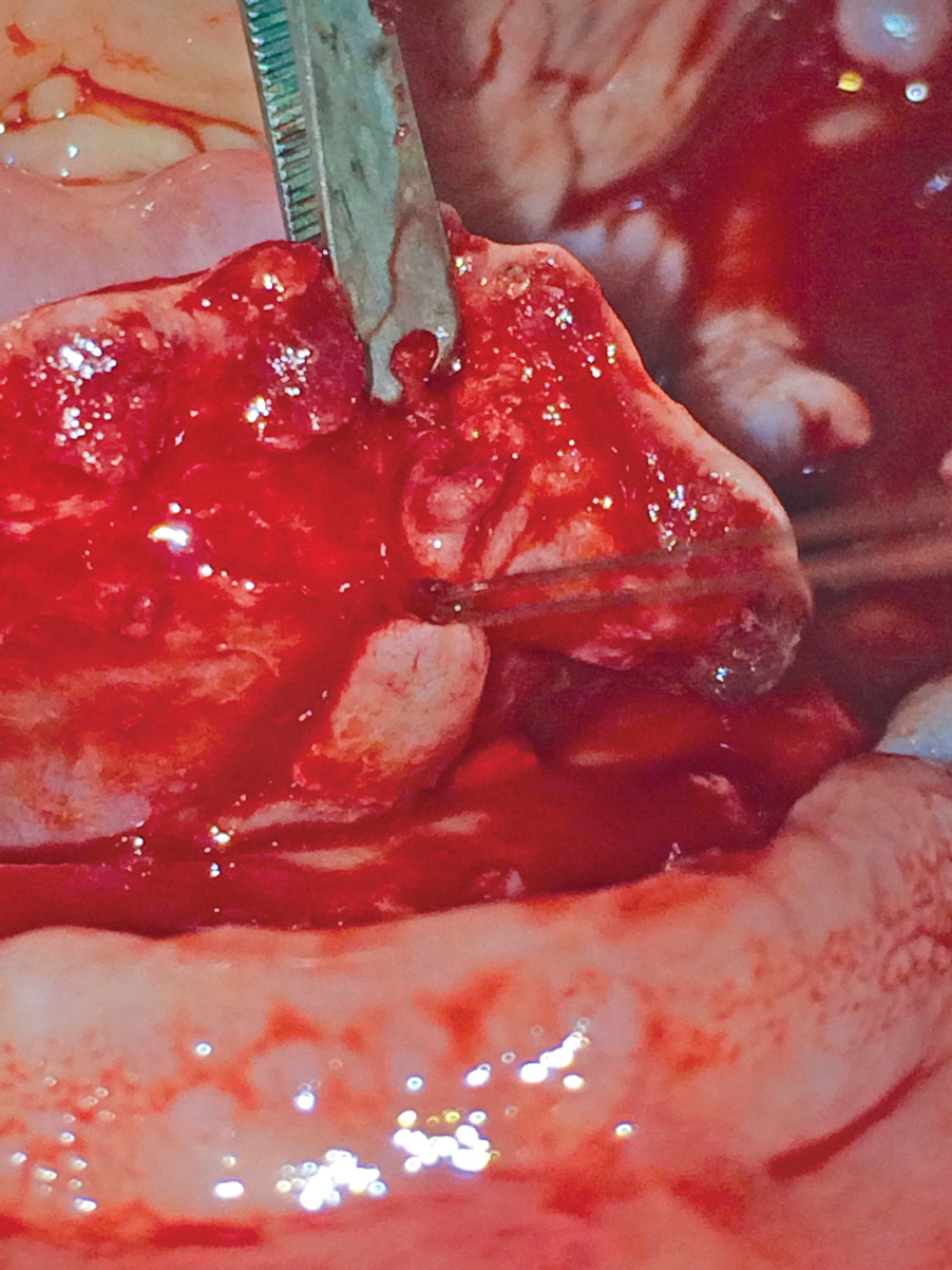Initial treatment in these situations involves administration of local anesthetic with at least 1:100,000 epinephrine.21 In most cases, the vasoconstrictor effect of epinephrine is enough to stop the hemorrhaging. Should the vasoconstrictor fail to alleviate the problem, an electrosurgical generator or laser with a coagulation setting may be applied to the source of hemorrhage. A third option for containing the bleed is to use a resorbable suture to tie off the vessel posterior to the site of hemorrhage (Figure 2).