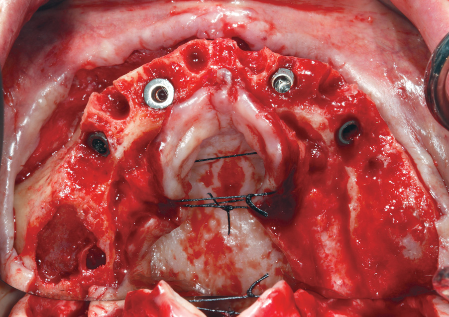 To overcome this complication, the author carefully reduces the residual maxillary crestal bone until crestal exposure of the Schneiderian membrane is achieved (Figure 5). On crestal visualization of the Schneiderian membrane, the author uses curettes to lift the membrane apically from the anticipated plane of bone reduction (Figure 6). The maxillary bone is then reduced apically, and the process is repeated until the desired amount of bone reduction is achieved. When performed in this manner, the Schneiderian membrane remains intact while crestal areas of reduced maxillary bone will have openings of varying degrees depending on the amount of bone reduction (Figure 7). The author does not augment these openings with bone graft and simply closes the surgical site with primary closures of thick mucogingival flaps. To date, patients receiving treatment from the author in this fashion have had no adverse outcomes (Figure 8).