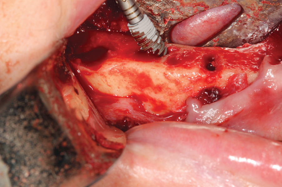 All-on-4–style treatment typically involves reduction of alveolar and/or basal bone (Figure 9) to achieve adequate restorative space for both the interim and final prostheses.25-27 During reduction of this bone, exposure of intraosseous nutrient canals28,29 may lead to hemorrhaging that may obscure visualization of the surgical field. If left uncontrolled, hemorrhaging from nutrient canals can become significant, resulting in excessive blood loss. It is not uncommon to encounter multiple concurrently hemorrhaging intraosseous nutrient canals, especially during mandibular bone reduction.