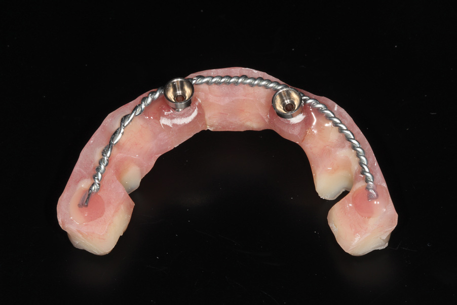 To reduce the incidence of postsurgical fracture of All-on-4–style provisional restorations, the author reinforces transitional prostheses with 1-mm-diameter interplaited steel wire (Figure 19 and Figure 20) based on the findings of research by Yamaguchi et al,49 Li et al,50 and others.51-53 Upon incorporating this reinforcement technique for All-on-4–style provisional restorations, the rates of fracture for the author’s provisional restorations decreased from 16.14% to 4.17%.46